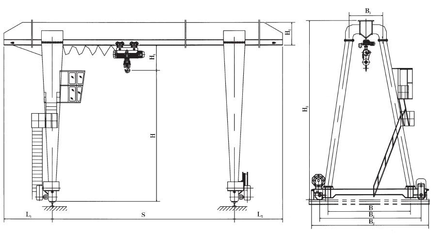 1、 MH型電動(dòng)葫蘆門式起重機(jī)與CD1、MD1等型號(hào)的電動(dòng)葫蘆配套使用,是一種有軌運(yùn)行的中小型起重機(jī)。