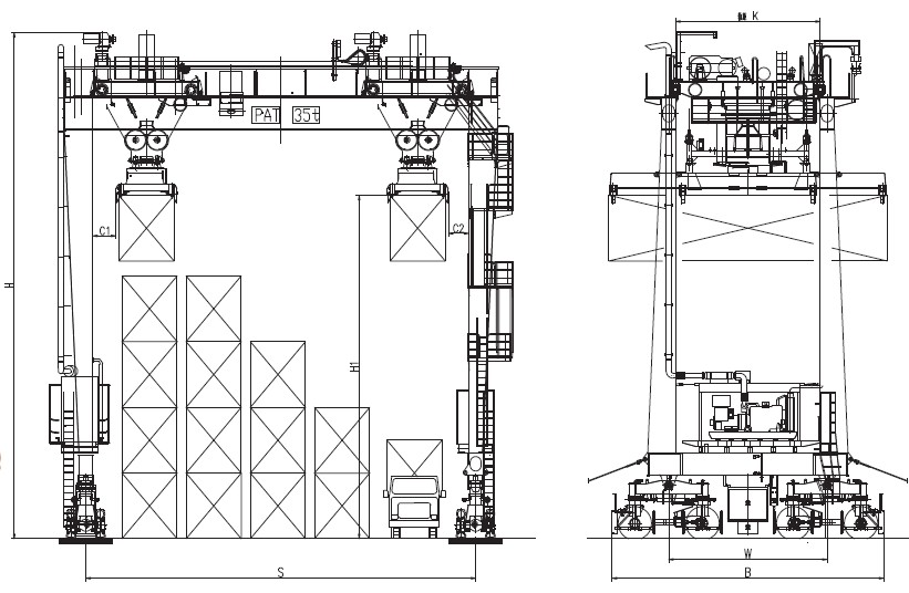 2、 采用專用集裝箱吊具,可起吊20、40、45標準集裝箱及液壓儲存罐。